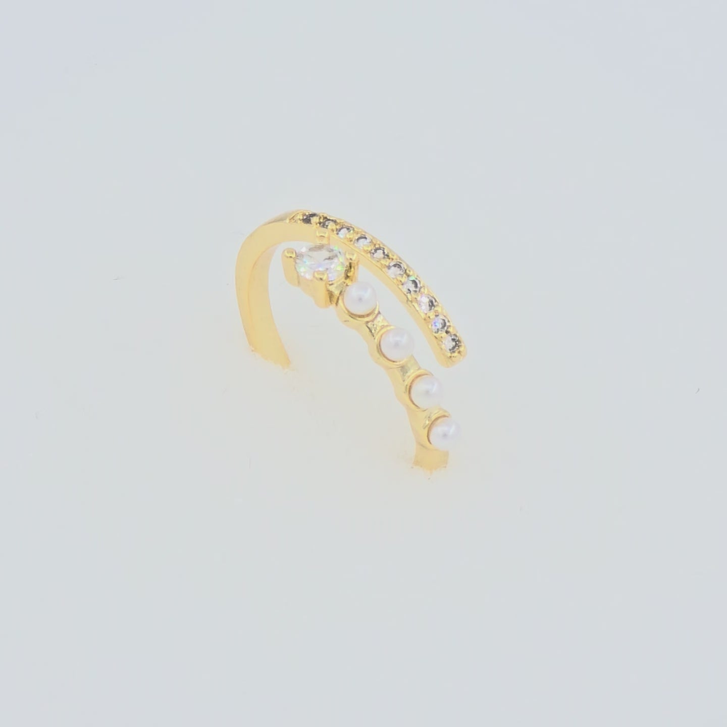 Cette bague ouverte dorée se distingue par sa ligne délicate de zircon et ses cinq perles nacrées. Un modèle original qui combine brillance et douceur, idéal pour sublimer vos mains.